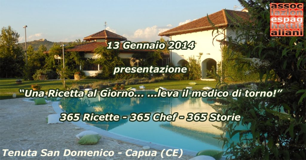 Il 13 Gennaio 2014 verrà presentato il libro, prodotto dall’Associazione Spaghettitaliani, “Una Ricetta al Giorno… …leva il medico di torno”, che contiene 365 ricette “donate” all’Associazione da 365 Chef diversi provenienti da tutt’Italia, ma non solo, di cui alcuni di fama internazionale come Paolo Barrale, Nicola Batavia, Heinz Beck, Pino Lavarra, Tano Simonato, …, solo per citarne alcuni.