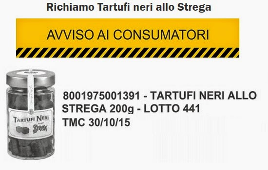 Le catene di supermercati Carrefour e Ipercoop hanno comunicato tramite il loro sito il ritiro dei vasetti “Tartufi neri allo Strega”. Il prodotto in questione è contenuto nella confezione in vetro da 200 grammi, lotto 441 e termine minimo di conservazione (TMC) al 30/10/15.